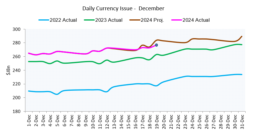 The net currency issue for the period under review translated to an increase of $12.1 billion or 4.6 per cent in the currency stock for the period 01 to 19 December 2024. This increase was lower than the Bank’s projection for an expansion of 7.1 per cent for the period, but higher than the 3.7 per cent growth in net currency issue for the corresponding period in 2023.