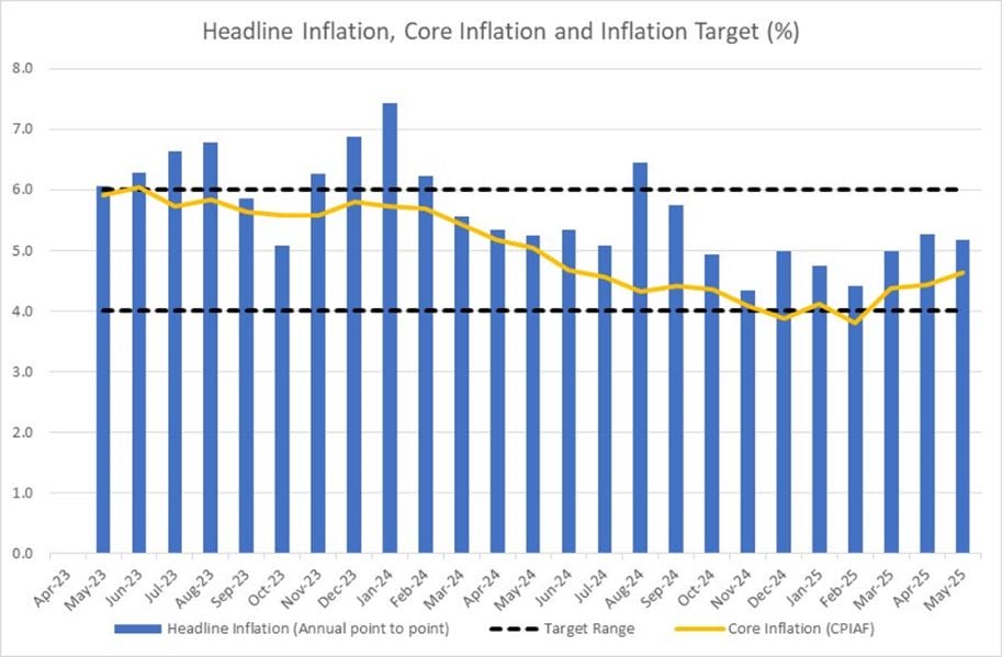 - Inflation has remained stable within the Bank’s target range of 4.0 to 6.0 per cent since September 2024. Annual headline inflation at May 2025, as reported by the Statistical Institute of Jamaica (STATIN), was 5.2 per cent, in line with the outturn at May 2024. Core inflation (which excludes the prices of agricultural food products and fuel from the consumer price index (CPI)) was 4.6 per cent at May 2025, remaining below the upper limit of the target since July 2023.